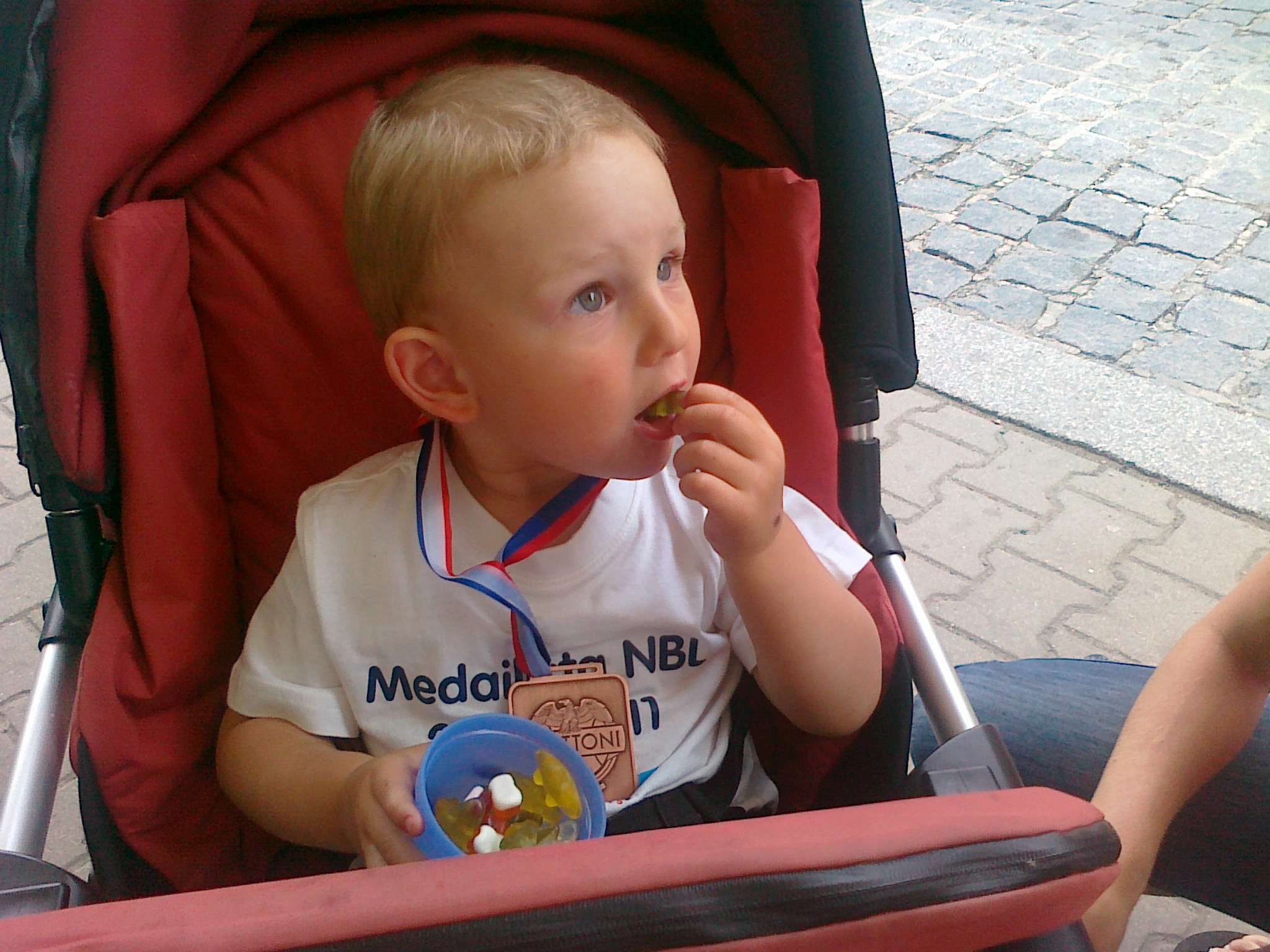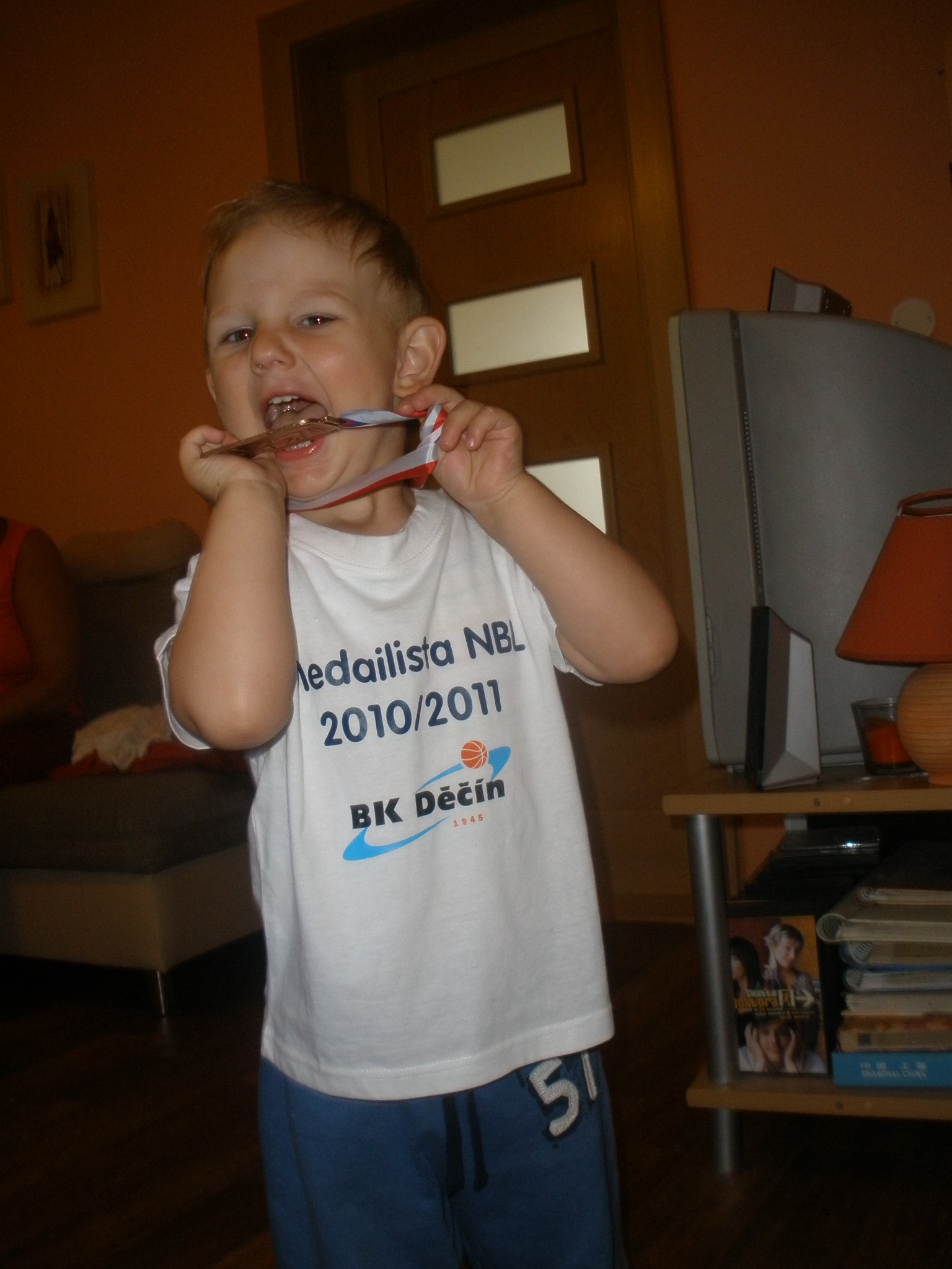 „Vopravdovej“ má medaili, šálalalala . . .A no, můj malej prďolka převzal štafetu a dneska se o medaili, kterou jsem mu slíbil, staral jen a jen on. Dokonce zkoušel, jestli je pravá, takže i zoubky dostaly zabrat, to jak je ocucaná, o tom ani nemluvím, ale vypadá to, že se s ní má docela rád 🙂 Takže mu budeme muset dodat další kousky a kdyby to šlo, tak prej klidně z jinýho kovu . . . 🙂